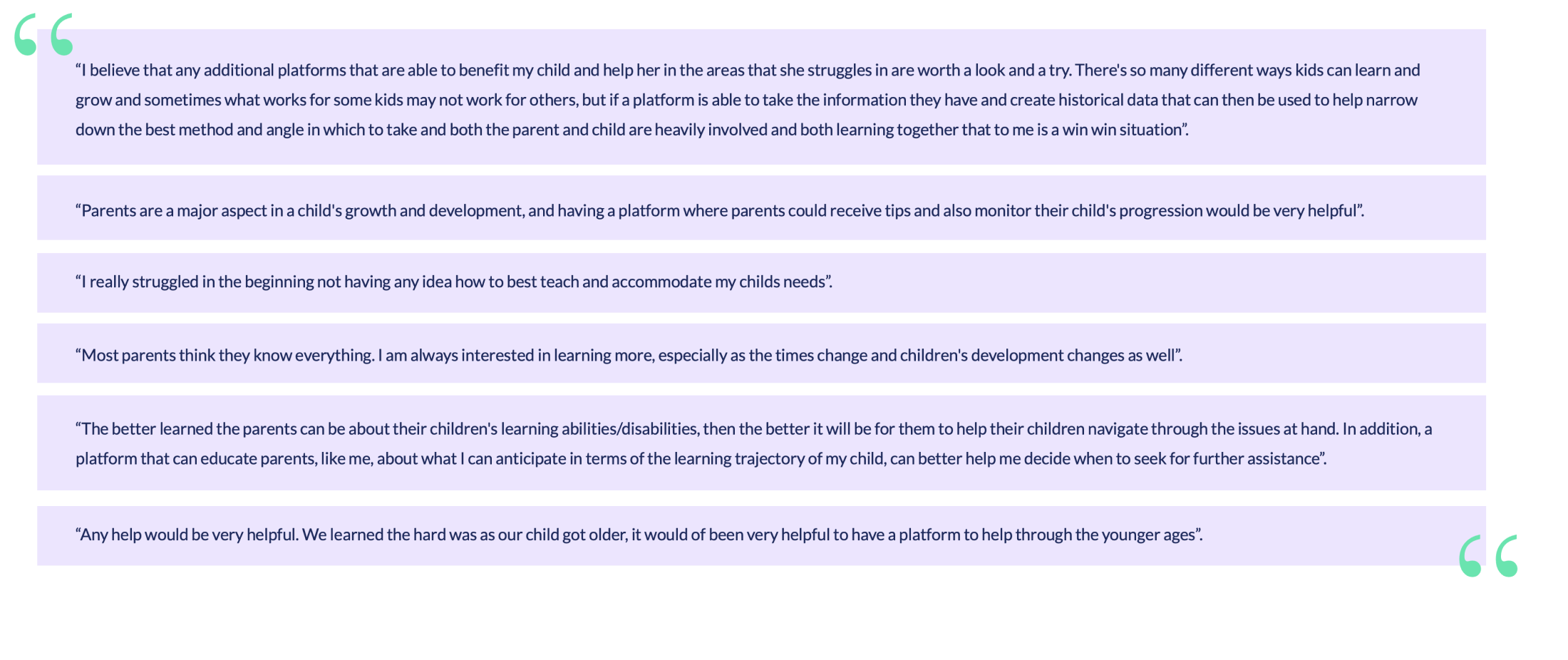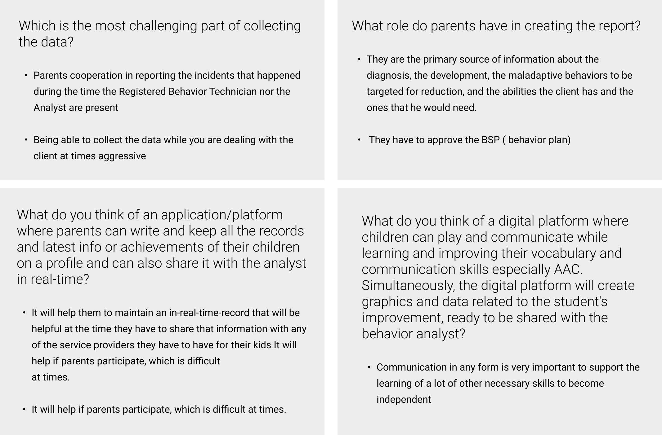 Through a series of interviews with Behavior Analyst and birth parents, I found out critical information that helped me define user needs, expectations and clarifying that those who needed the help were not the BAs but the parents and caretakers.