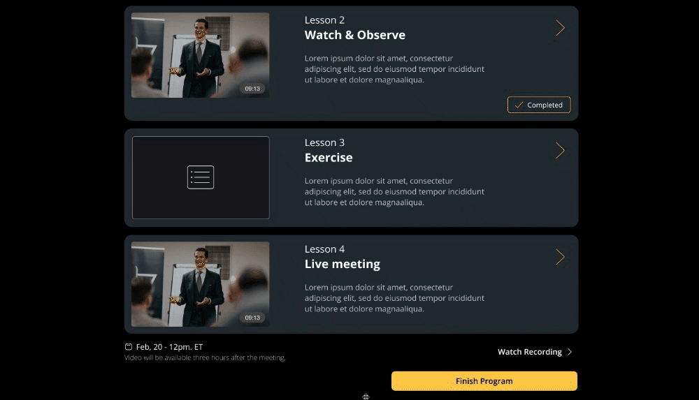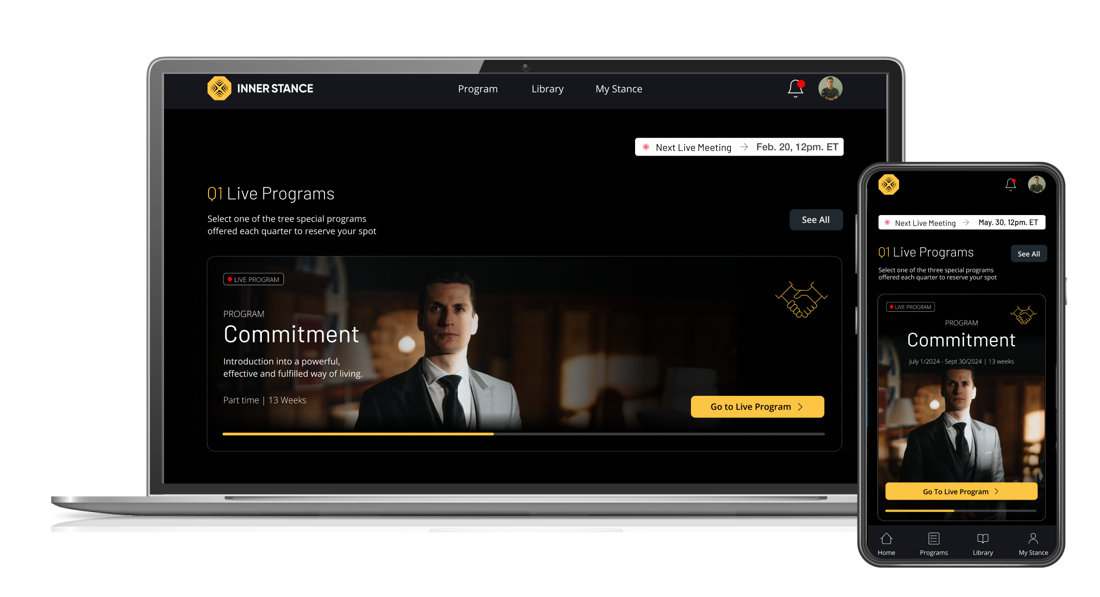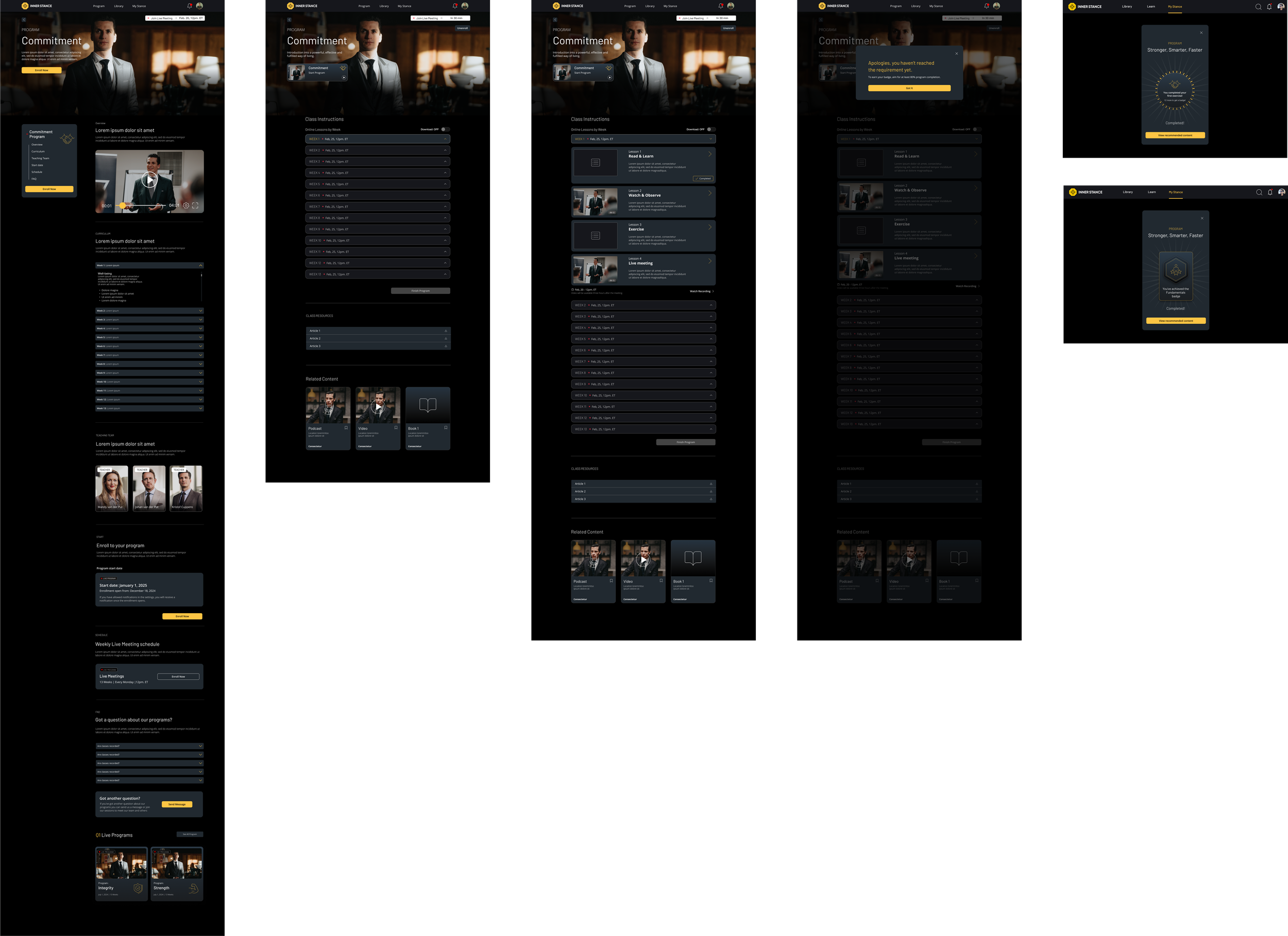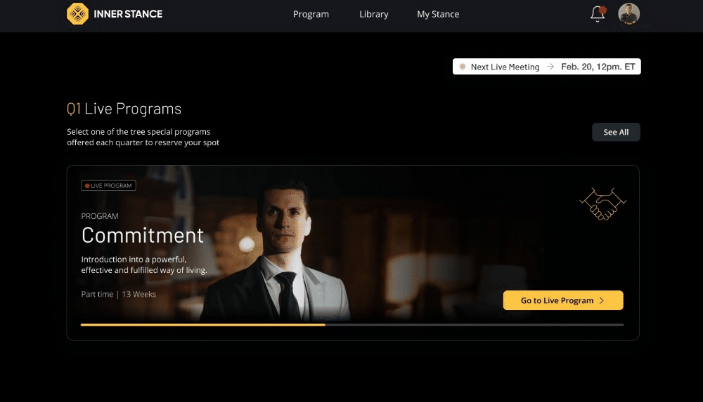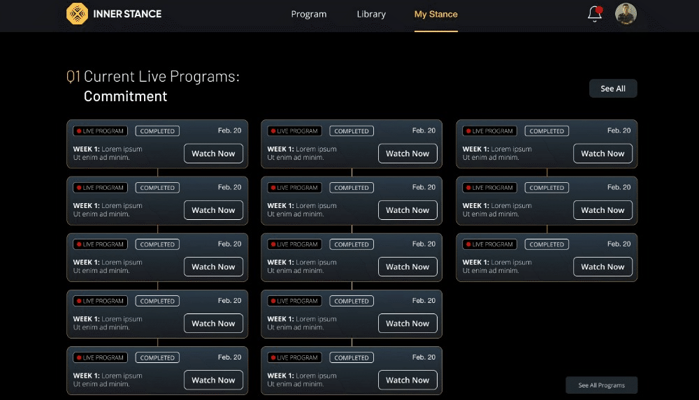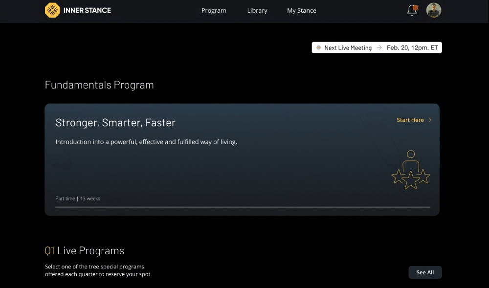 We applied design thinking and conducted UX research to create a user-friendly experience tailored to Inner Stance's needs. We designed a hybrid native and web app that effectively integrated live meetings, notifications, and content delivery. To encourage ongoing participation, we incorporated a rewards and badges system that recognized users' progress through the program. The UI design was crafted to be modern, visually appealing, and intuitive, ensuring easy navigation and engagement with the platform.