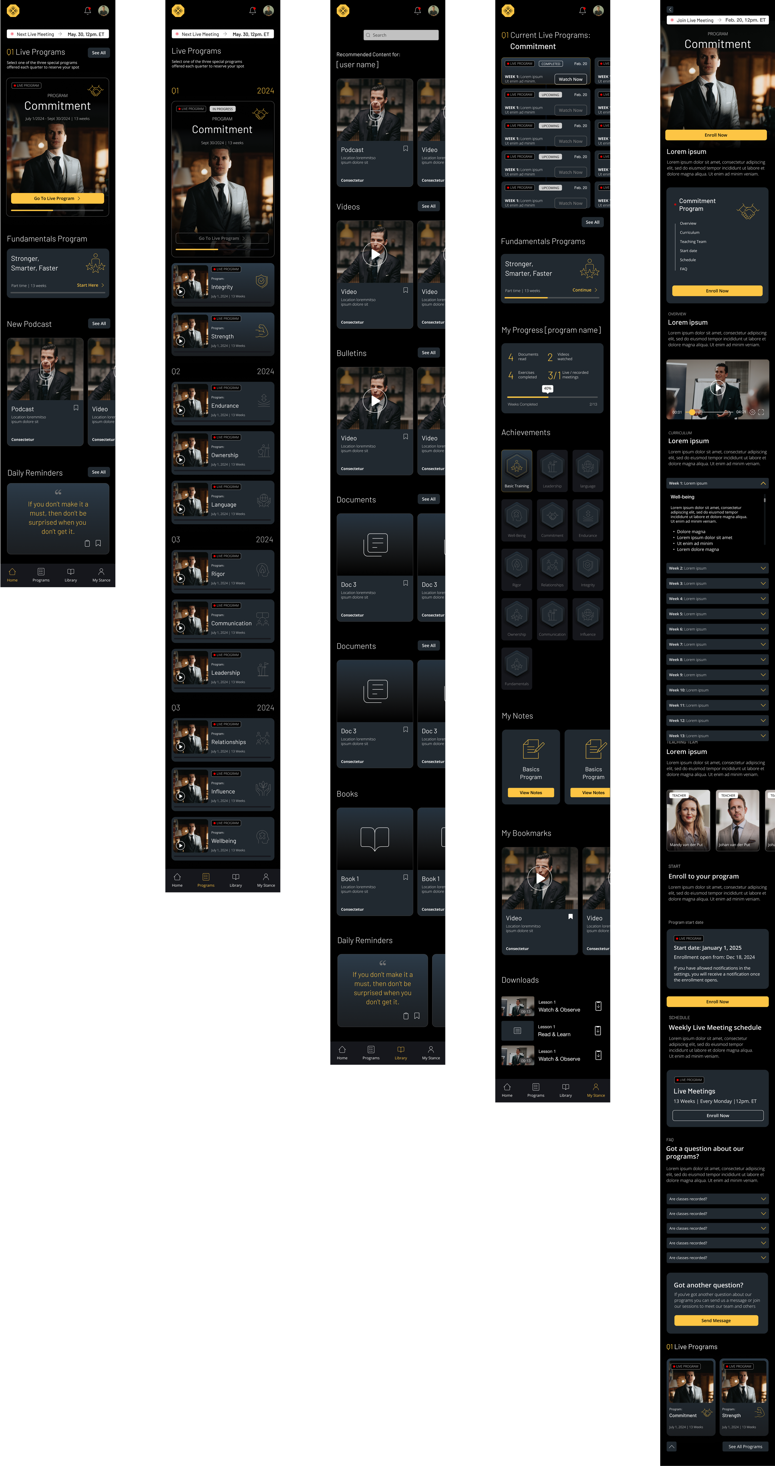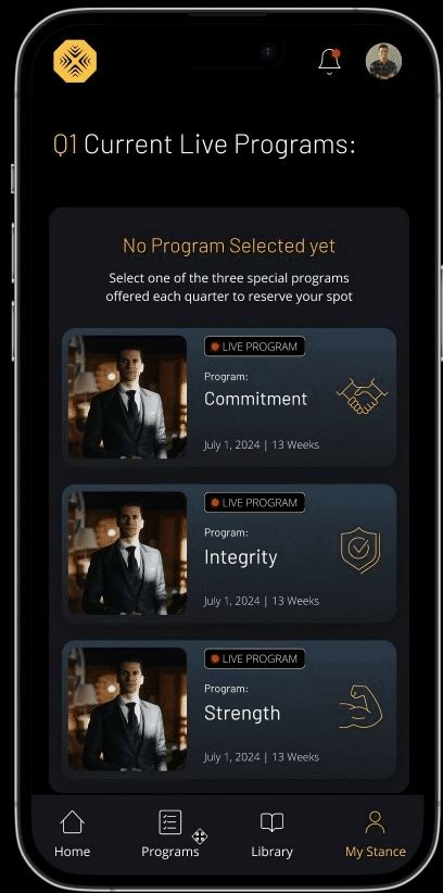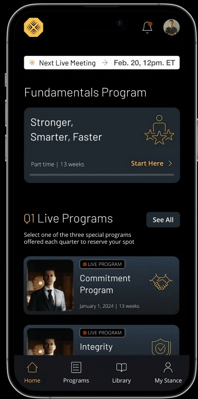 The app became the backbone of Inner Stance's leadership training program, offering a comprehensive platform for users to engage with the curriculum. Real-time notifications ensured users stayed informed about upcoming live meetings, while the rewards system maintained user interest and motivation. The modern design and user-friendly interface delivered a cohesive and engaging learning experience, perfectly aligned with Inner Stance’s goal of fostering leadership development in an accessible and motivating way.